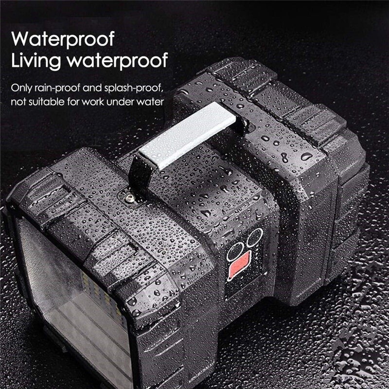 Description Description: - Projector Professional and High Brightness LED Reflectors. - Portable two-way light source for a variety of occasions. - It offers illumination distances of up to 300-500 meters and two different lighting modes, perfect for illuminating the entire room or camp. Built-in large-capacity rechargeable battery for long lighting hours. Waterproof,prevent splashing at various angles,suitable for outdoor environments and bad weather conditions. - Perfect for outdoor activities such as hiking, camping, hunting, cycling and more outside activities. Specification: Light bulb: L2 + 35 patch lamp beads Power: 40w Battery: 2 * 32650 Battery (included) Battery capacity: 10000 mAh Working time: 4-6 hours Charging time: 2-3 hours Lumen: 100000lm Charging voltage: 5v Discharge voltage: 4A Material: ABS Colour: Black Mode: 3modes Function: multi-level switch, tact switch, turn on weak medium light in turn (low white light - white light - strong white light patch (red / blue / flash) P50 strong and weak flash) Battery indicator: The four sides are blue and fully illuminated when fully charged. Charging indicator: When charging, the green light flashes. Fully charged, the green light is always on Charging: USB straight Package: 1 *brightest flashlight 1 * USB charging cable