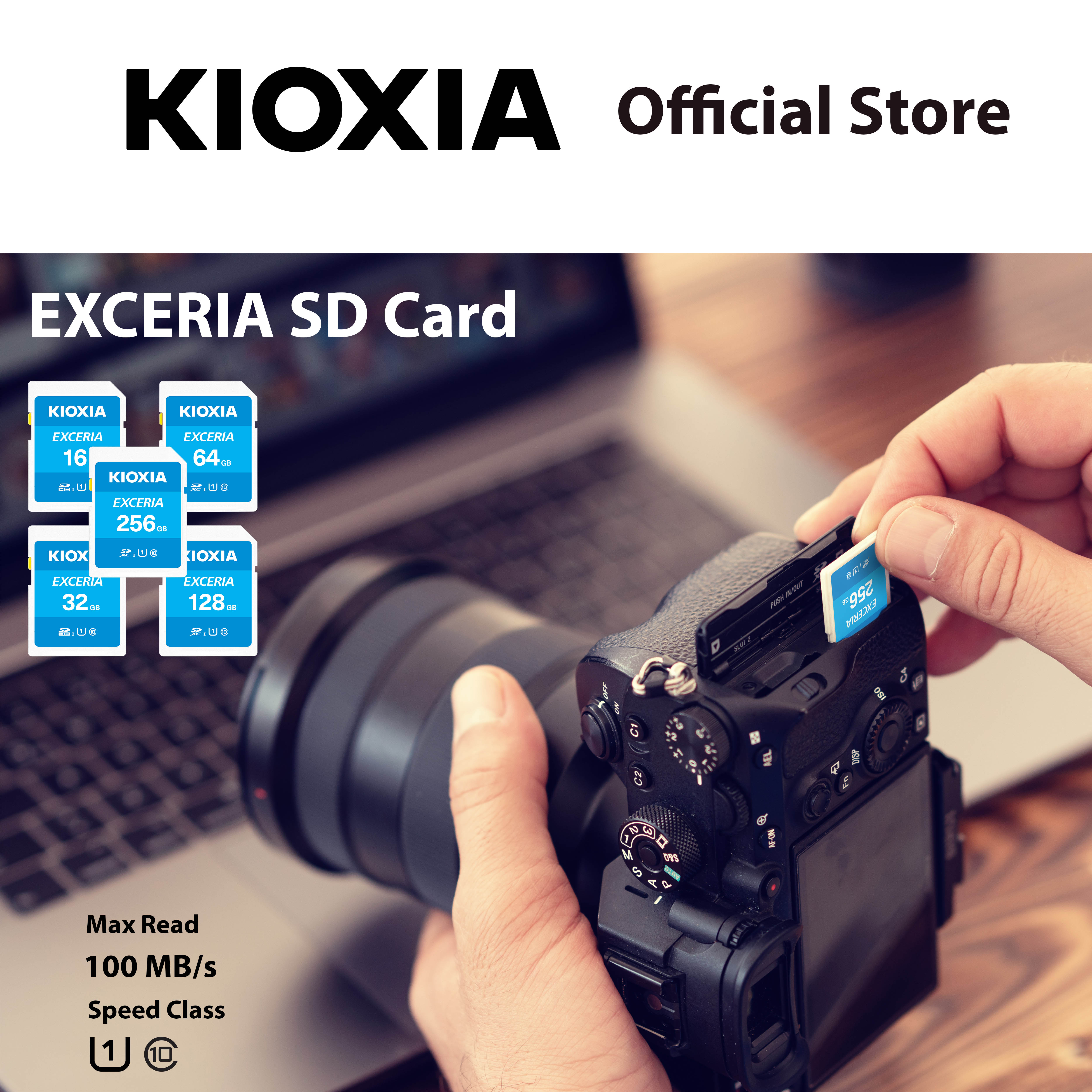 EXCERIA SD Memory CardSolid SimplicityKIOXIA EXCERIA SD memory cards have a read speed up to 100 MB/s(1), taking pictures and recording video on your digital camera is a breeze so you can focus on getting your best shot.Capacity16GB 32GB 64GB 128GB 256GB