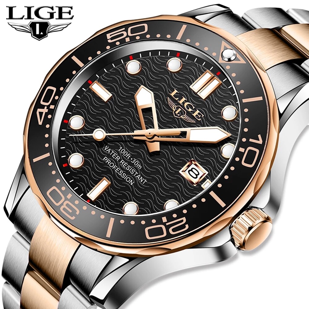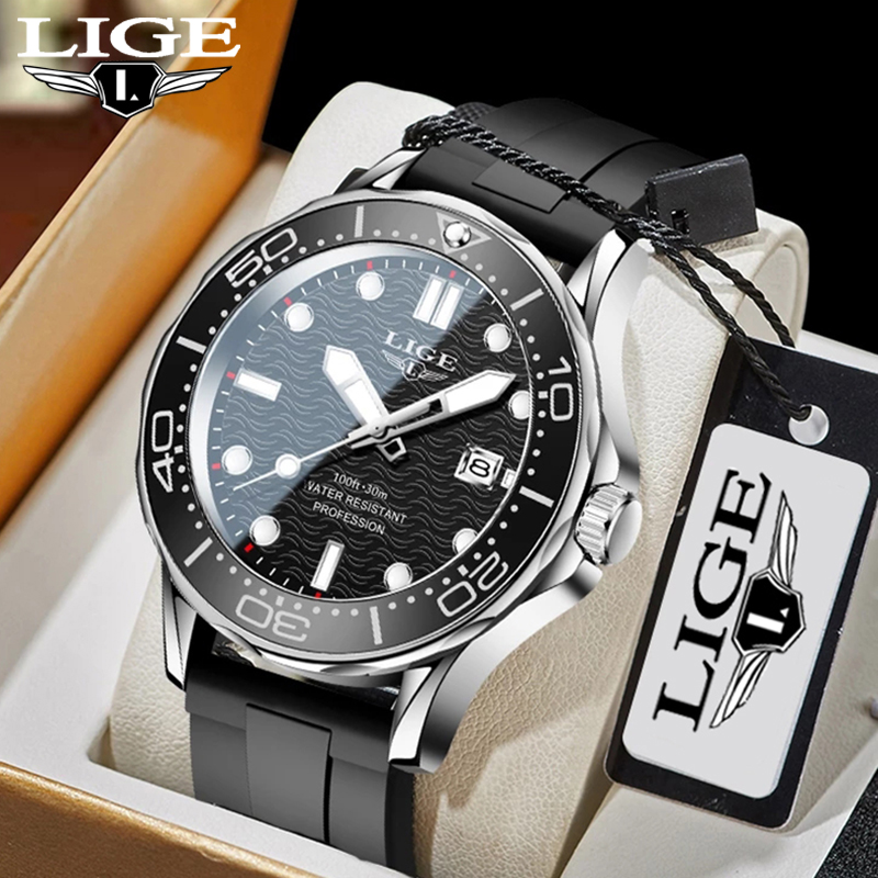 LIGE Sport Diver Watches For Men Stainless Steel Waterproof Date Clocks Men Watch Military Quartz Watch + Box