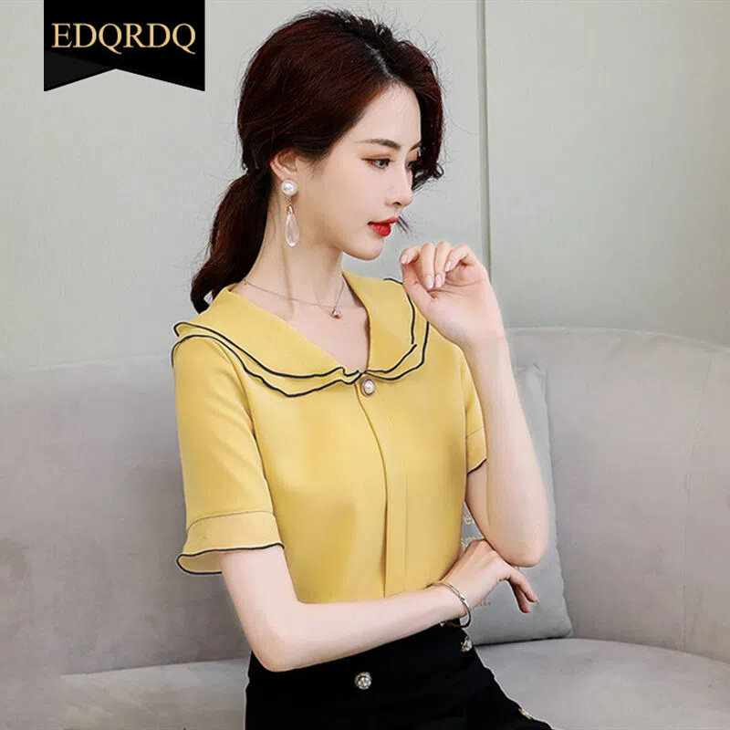 EDQRDQ Women's Doll Collar Puffy Sleeve Solid Color Chiffon Tops Short Sleeves Ruffle Blouse