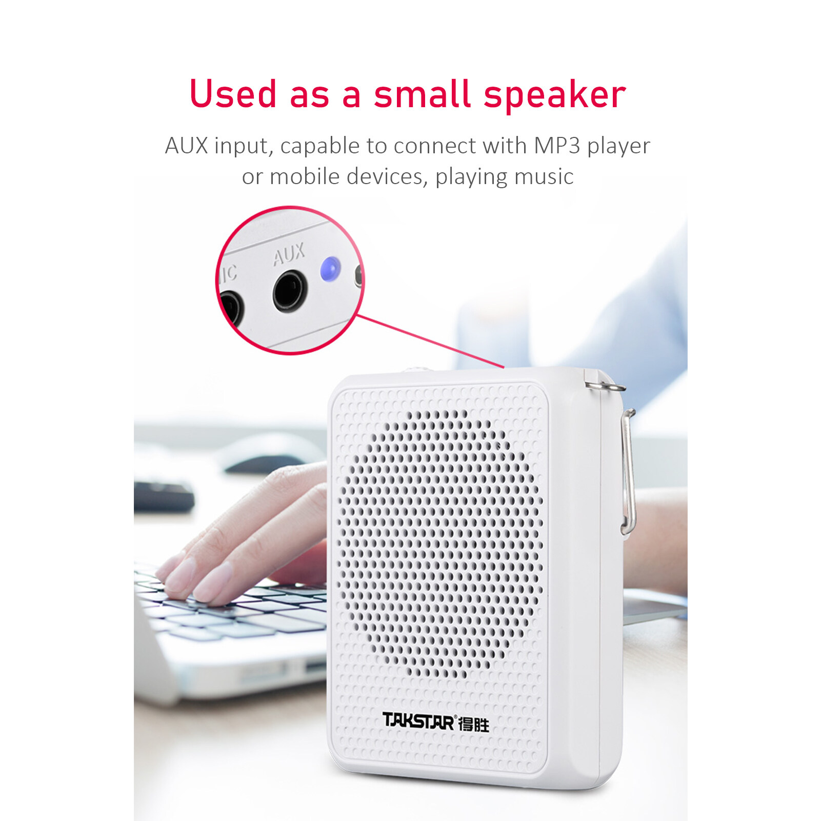 In addition to amplify voices, it can connect to MP3 player, smart devices via AUX input, as a small speaker, playing favourite music.