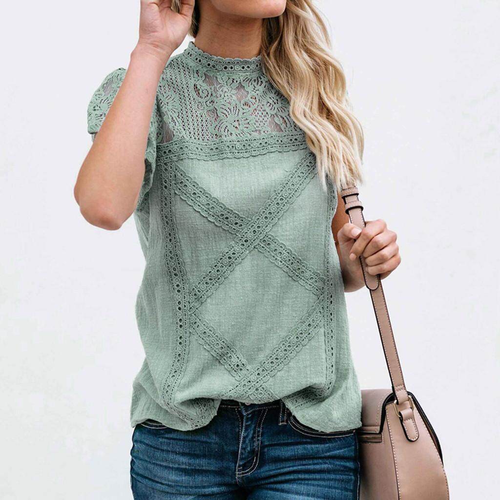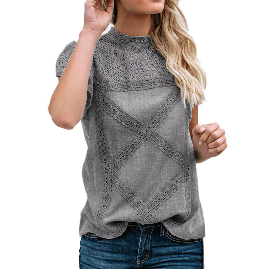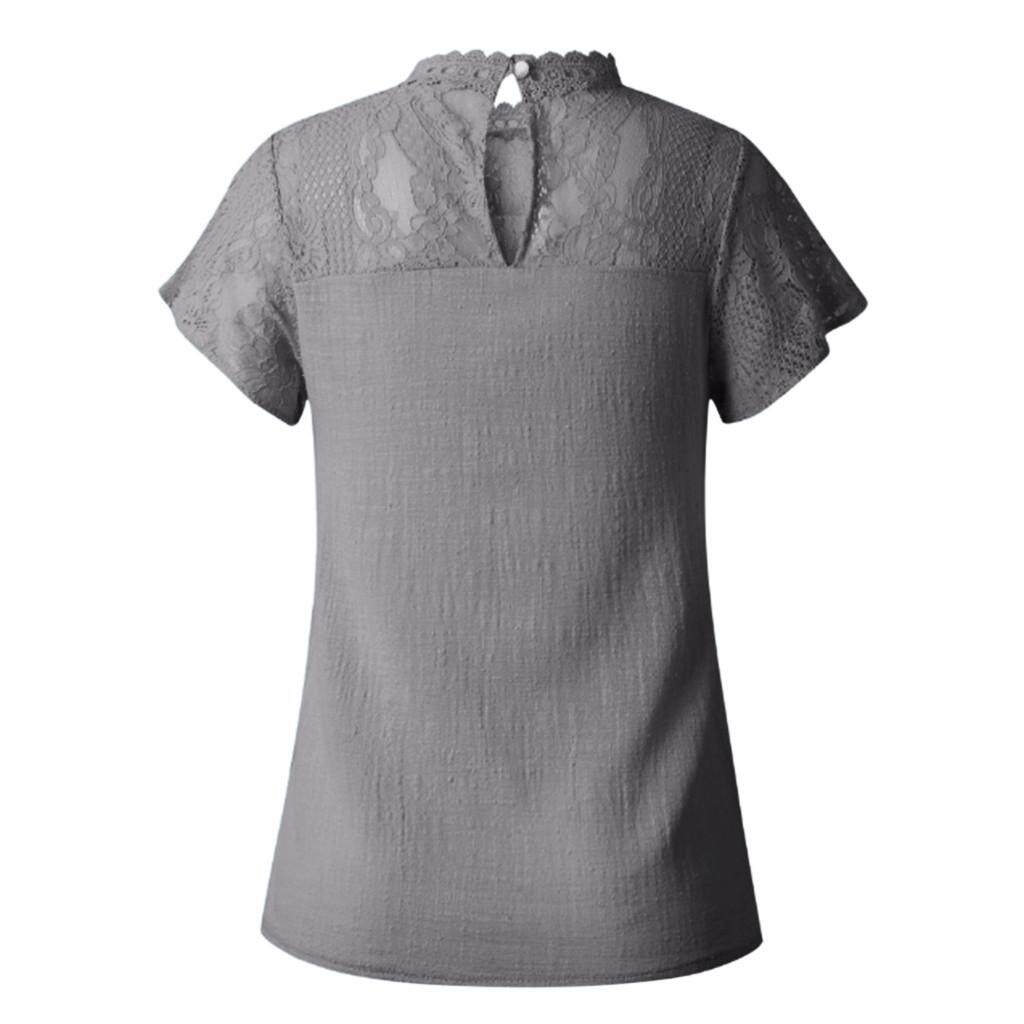 Womens Lace Patchwork Flare Ruffles Short Sleeve Cute Cotton Shirt Blouse Top Plus Size Loose Casual